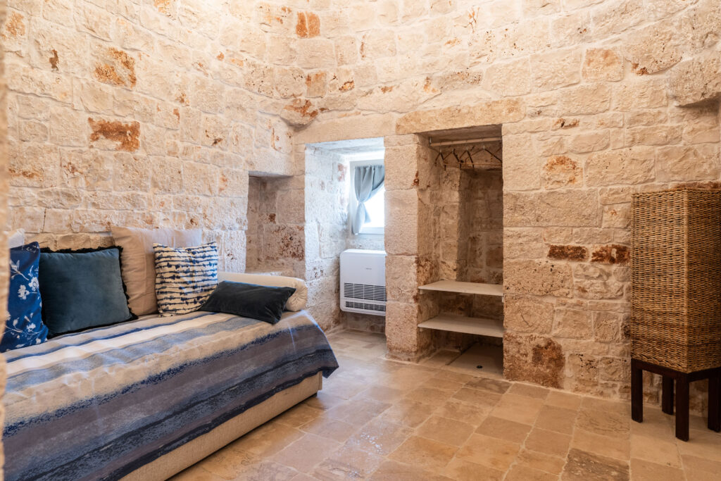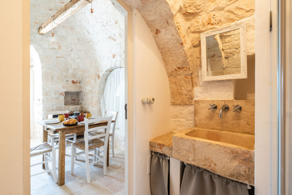 Charming Interiors and Modern Comforts The trulli can accommodate up to 4 guests and maintain the original identity of Apulian rural architecture, featuring wooden beams and traditional alcoves. The interior layout includes: