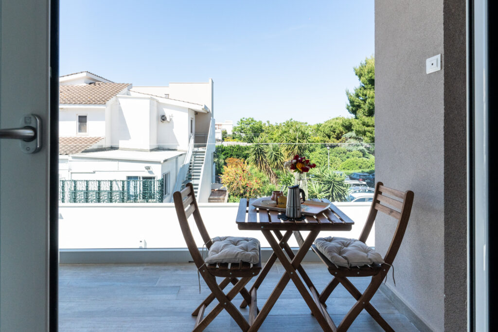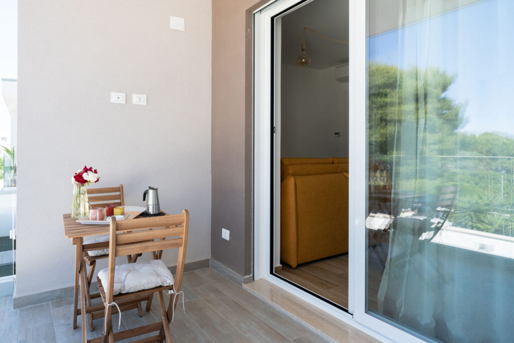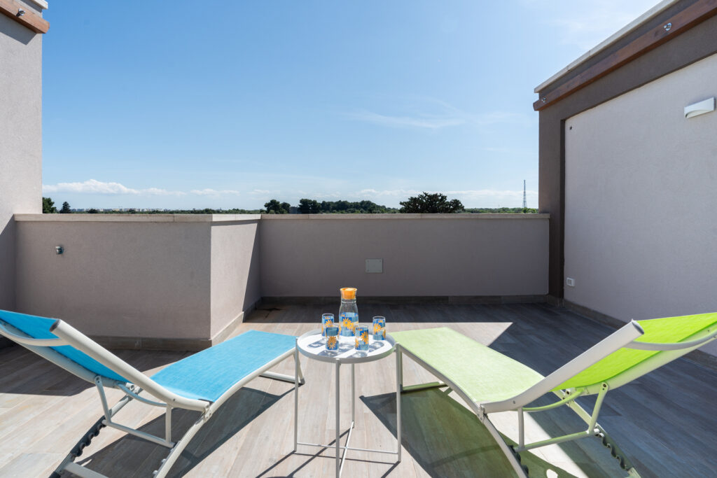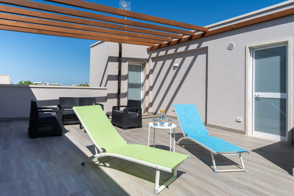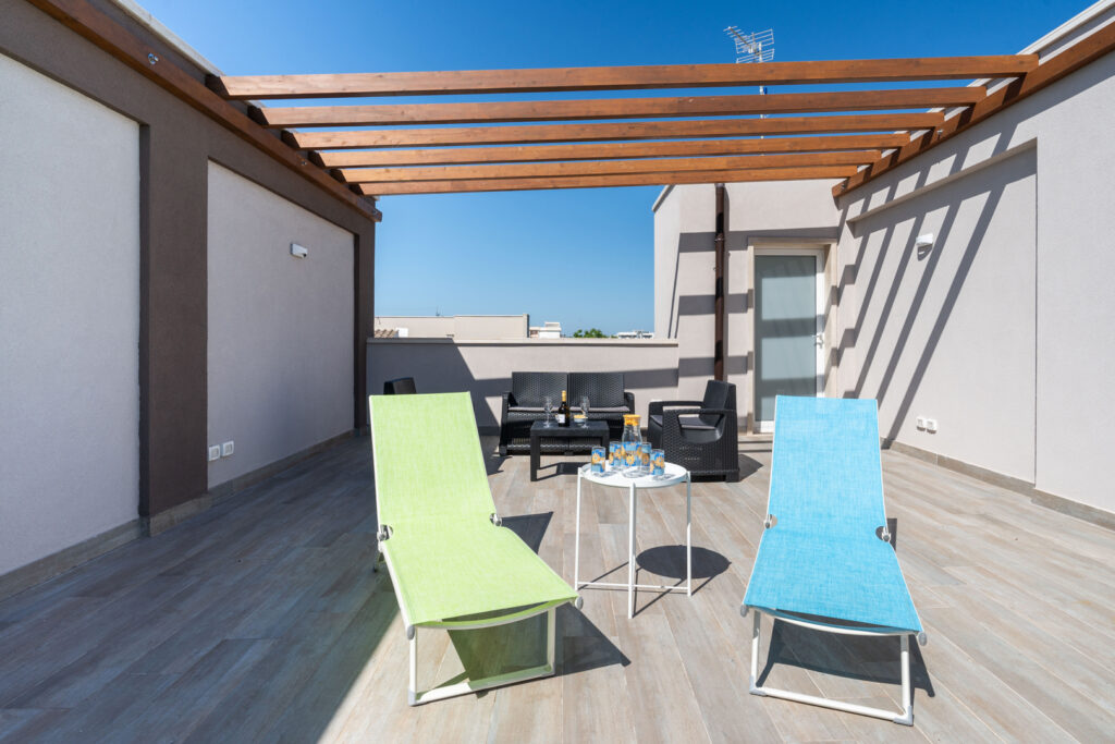Il secondo piano vanta una grande terrazza arredata con solarium e salottino da esterni. È lo spazio ideale per rilassarsi all’aperto e godere appieno della luce e del clima unico della Puglia.