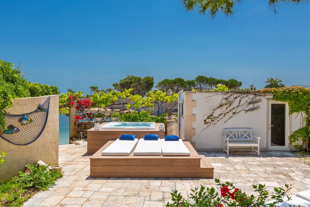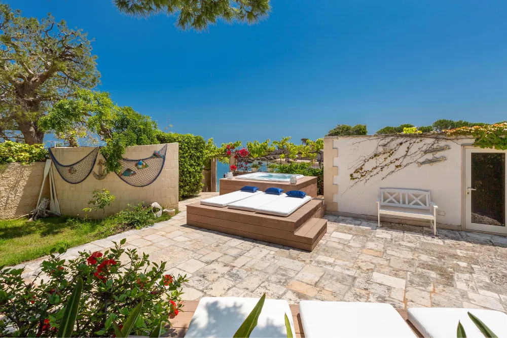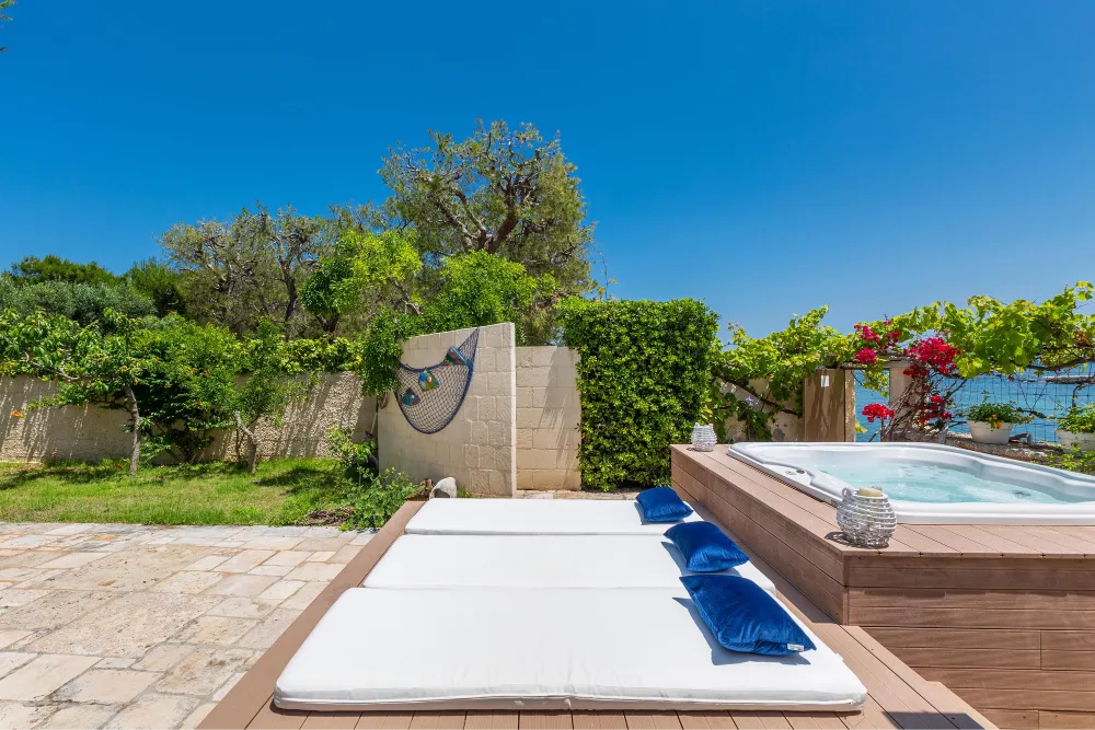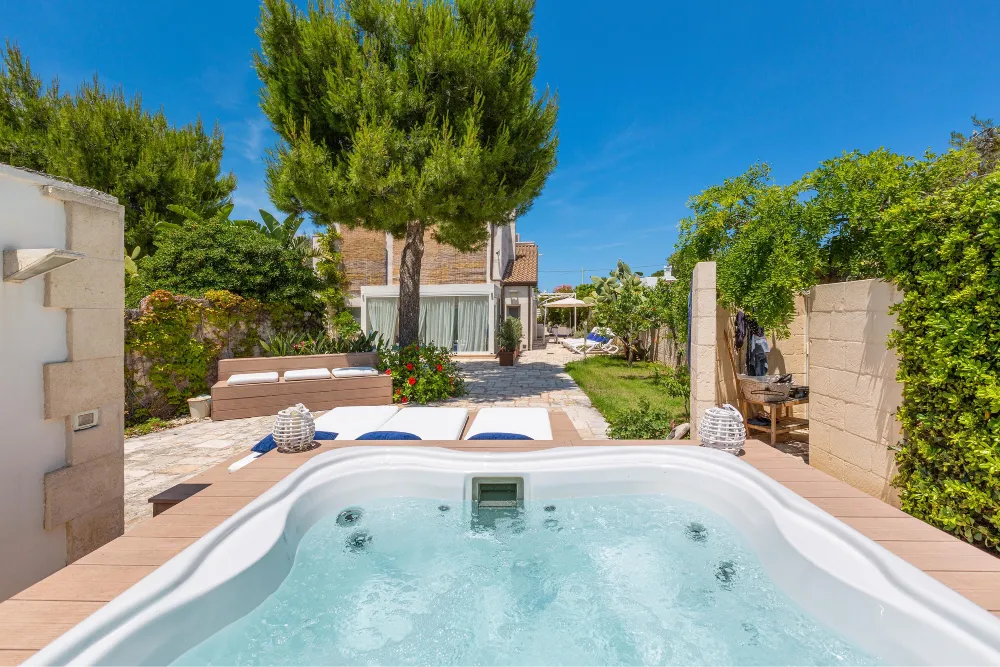 Lo spazio esterno, in parte con area relax coperta, è attrezzato con una bellissima Jacuzzi idromassaggio attorno a cui vi sono i lettini per il solarium. La mini piscina idromassaggio è, all’occorrenza, anche riscaldata.