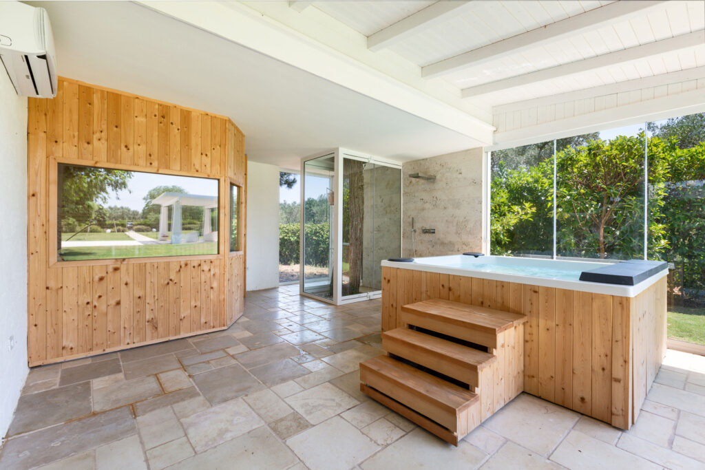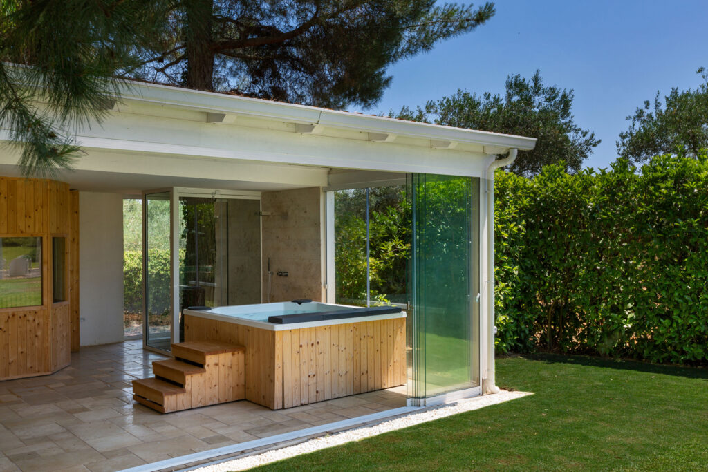 L’esterno vanta una piscina con solarium e una struttura in muratura con barbecue e forno. Potrete godere di un’area pic-nic sotto la pineta, una doccia esterna e una mini SPA con vetrate panoramiche. Gli interni includono ogni comfort moderno. Ad esempio, troverete aria condizionata, Wi-Fi, lavastoviglie e macchina per il caffè.